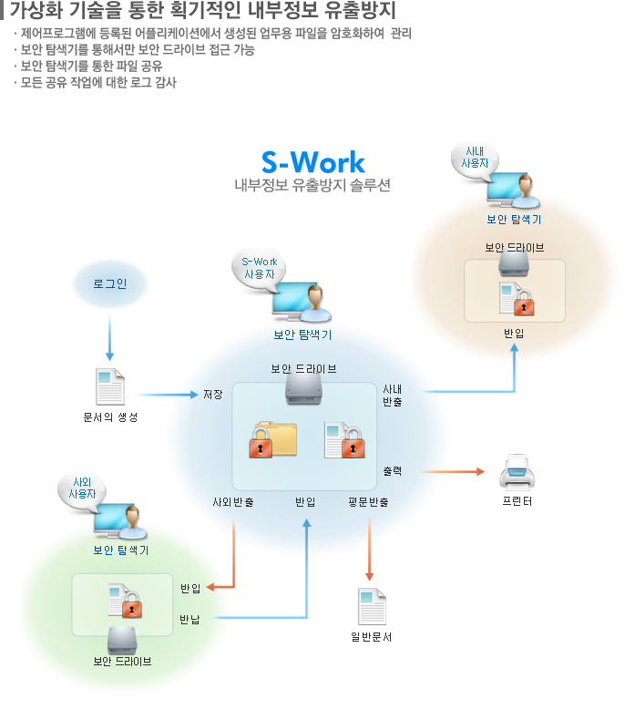 S-WorkÀº ±â¾÷ ¹× ±â°üÀÇ Áß¿äÇÑ Á¤º¸¸¦ ¾ÇÀÇÀûÀ¸·Î »ç¿ëÇÏ·Á´Â ³»ºÎÀÎ, ±×¸®°í ¿ÜºÎ·ÎºÎÅÍ ±â¹ÐÁ¤º¸¸¦ ºÒ¹ýÀûÀ¸·Î ȹµæÇÏ·Á´Â ¿ÜºÎÀÎÀ¸·ÎºÎÅÍ ÀÚ·á À¯ÃâÀ» ¹æÁöÇÏ´Â ³»ºÎÁ¤º¸ À¯Ãâ¹æÁö ¼Ö·ç¼ÇÀÔ´Ï´Ù. S-WorkÀº ±â¾÷ ¹× ±â°ü ³»ÀÇ ÀÛ¾÷¿µ¿ªÀ» °¡»óÀÇ º¸¾Èµå¶óÀ̺ê·Î ¼³Á¤ÇÕ´Ï´Ù. S-Work´Â »ç¿ëÀÚ°¡ Á¦¾îÇÁ·Î±×·¥À» ÅëÇÏ¿© ÀÛ¼º, ÆíÁýÇÑ ¸ðµç ÀڷḦ º¸¾Èµå¶óÀ̺꿡 ÀúÀåµÇµµ·Ï ÇÕ´Ï´Ù. ÀÚ·á °øÀ¯ ¹× Çù¾÷À» À§Çؼ ´Ù¸¥ »ç¿ëÀÚ¿¡°Ô ÆÄÀÏÀ» Àü´ÞÇÒ ¶§´Â º¸¾ÈŽ»ö±â¸¦ ÅëÇØ¼¸¸ °¡´ÉÇϸç, Á¢±Ù ´ë»óÀÚ¸¦ ÁöÁ¤ÇÏ¿© ¹ÝÃâÇϵµ·Ï ÇÕ´Ï´Ù. ÀÌ·¸°Ô ¹ÝÃâµÈ ÆÄÀÏÀº ¾ÏÈ£ÈµÈ ÇüÅ·ΠÀϹݵå¶óÀ̺꿡¼´Â »ç¿ëÇÒ ¼ö ¾øÀ¸¸ç, ¸¶Âù°¡Áö·Î Á¢±Ù ´ë»óÀÚÀÇ º¸¾È µå¶óÀ̺꿡¼¸¸ »ç¿ëÇÒ ¼ö ÀÖ½À´Ï´Ù. Áï, S-WorkÀº ¾÷¹« ÀÚ·áÀÇ ¸ðµç ¶óÀÌÇÁ»çÀÌŬÀÌ º¸¾Èµå¶óÀÌºê ³»¿¡¼¸¸ ÀÌ·ç¾îÁöµµ·Ï ÇÔÀ¸·Î½á, ±â¾÷ ¹× ±â°üÀÇ ÀÛ¾÷ ¿µ¿ªÀ» º¸¾È µå¶óÀ̺ê·Î Á¦ÇÑÇÒ ¼ö ÀÖ½À´Ï´Ù. ¶ÇÇÑ S-WorkÀº º¸¾Èµå¶óÀ̺꿡 ´ëÇÑ ½Äº° ¹× ÀÎÁõ, ¾ÏÈ£È, µ¥ÀÌÅÍ À¯Åë¿¡ ´ëÇÑ °¨»ç ¸¦ ÅëÇÏ¿© Á¶Á÷ÀÇ ³»ºÎ Á¤º¸ À¯Ãâ À§ÇèÀ» ¿øÃµÀûÀ¸·Î Â÷´ÜÇÕ´Ï´Ù |